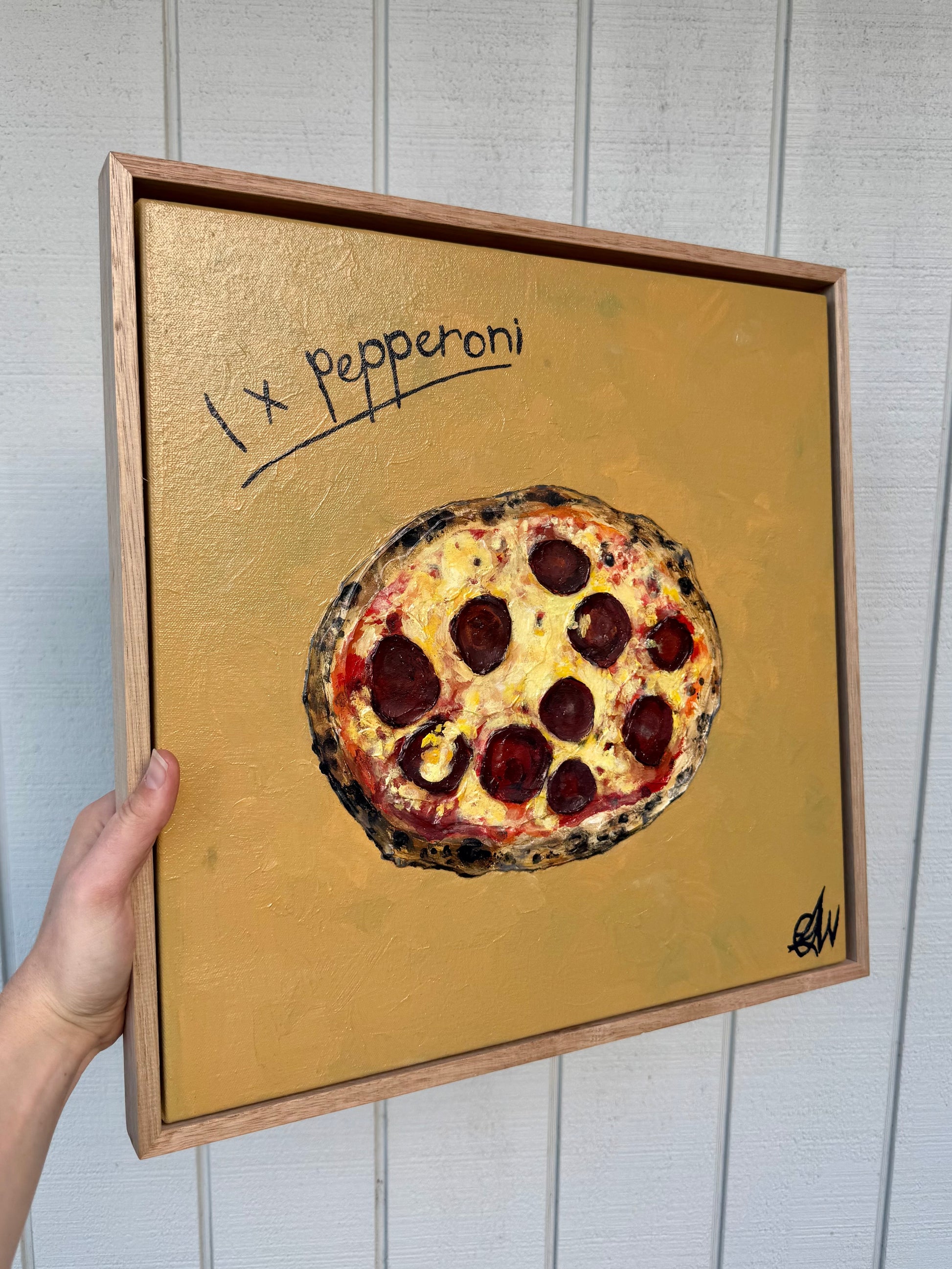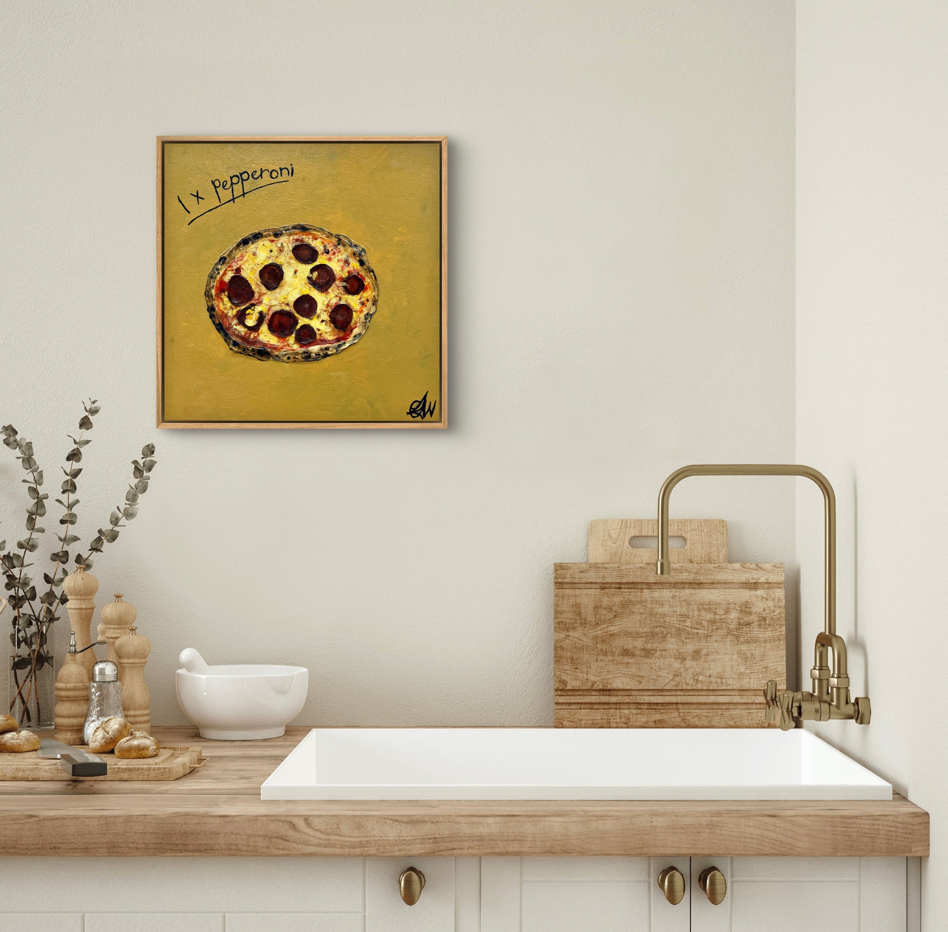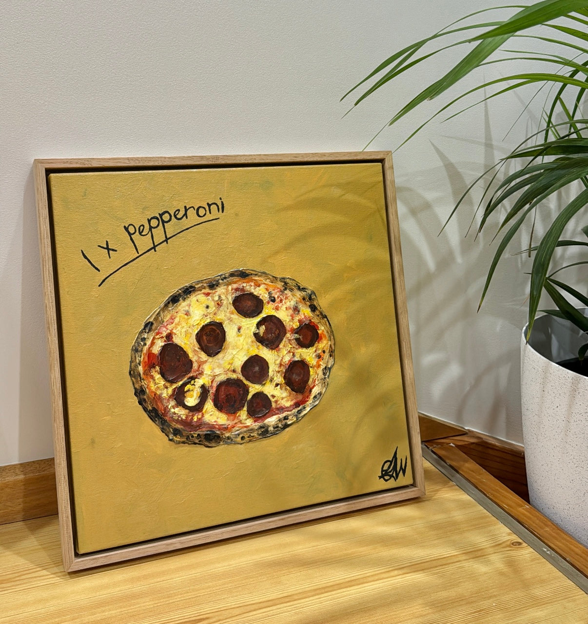 Stylised like a home delivered pizza. This piece was moulded to slightly protrude out of the canvas, I wanted it to look like someone just opened a pizza box to this view. This piece is a slice of Friday night comfort and good old relaxation, whilst the colour palette is minimal and easy to style.