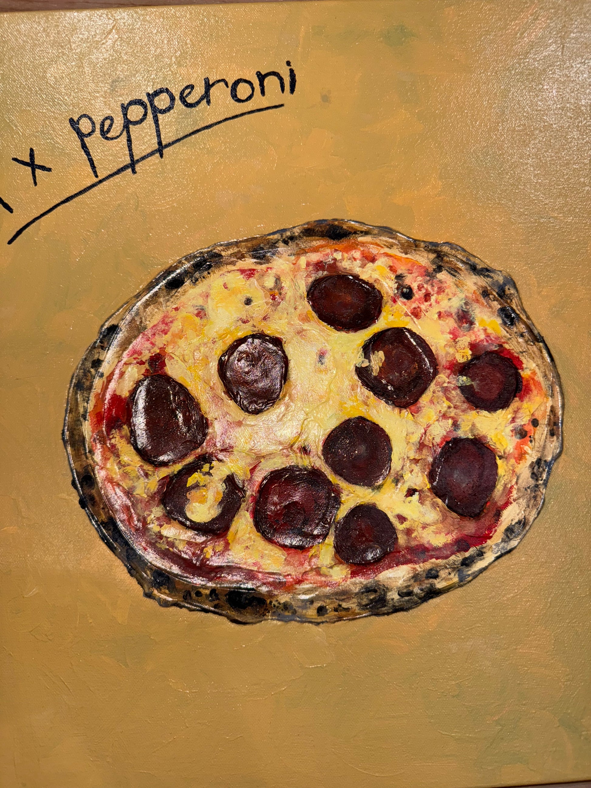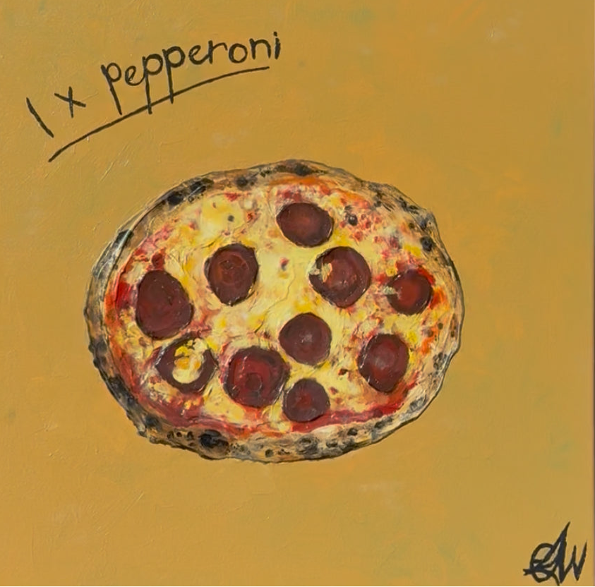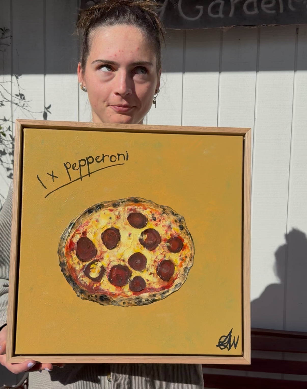 Stylised like a home delivered pizza. This piece was moulded to slightly protrude out of the canvas, I wanted it to look like someone just opened a pizza box to this view. This piece is a slice of Friday night comfort and good old relaxation, whilst the colour palette is minimal and easy to style.