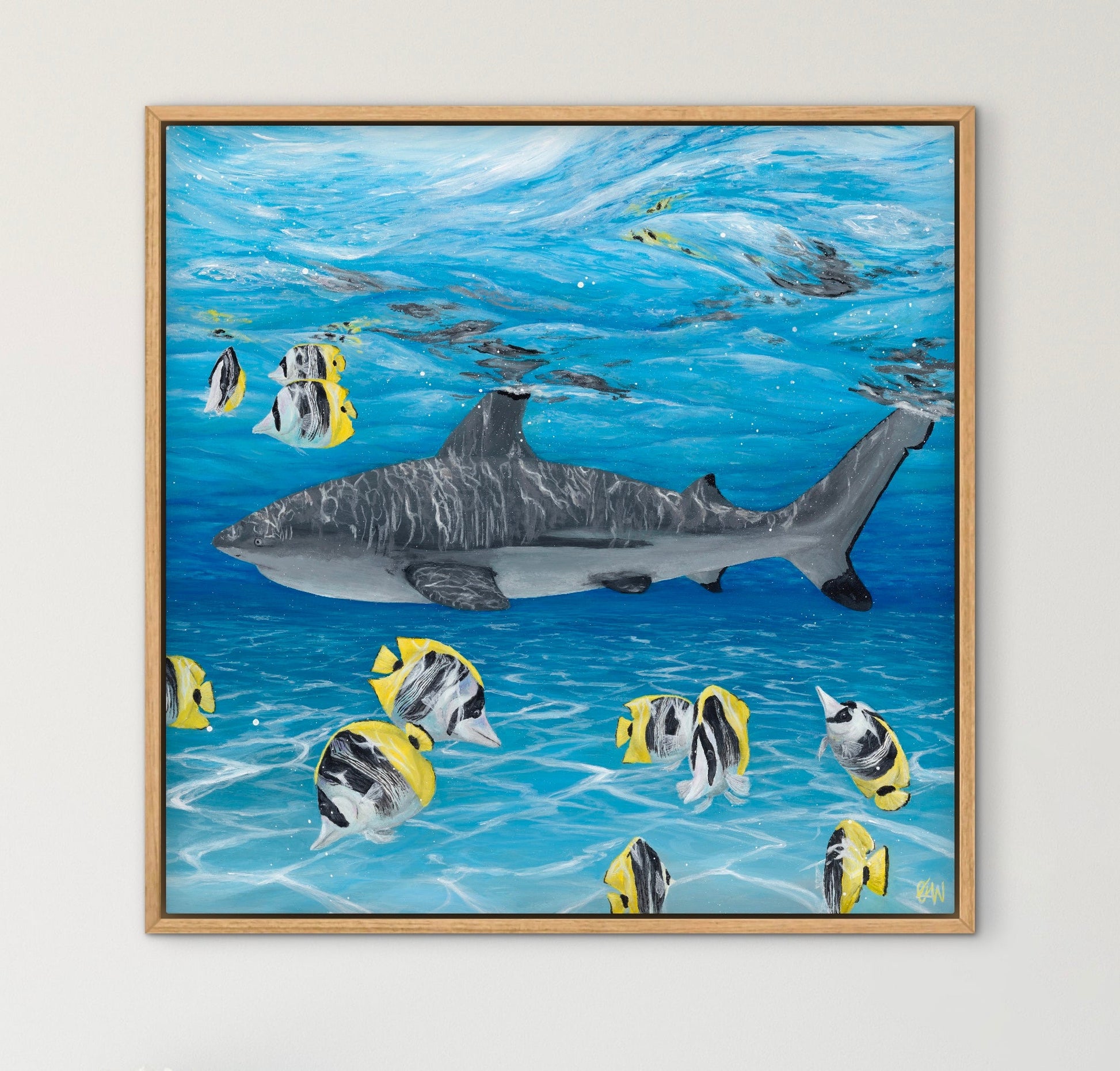 When creating this piece, I wanted people to feel as if they could dive into this painting. Though I know there’s a shark, black tip reef sharks are generally safe when not threatened. When I see white sand and clear water I feel a sense of calm and urge to be emerged within it, to feel that silky water on my skin, like a welcoming home hug from the ocean. The yellow fish enhance the clarity of the water through their clear details and contrasting colours.