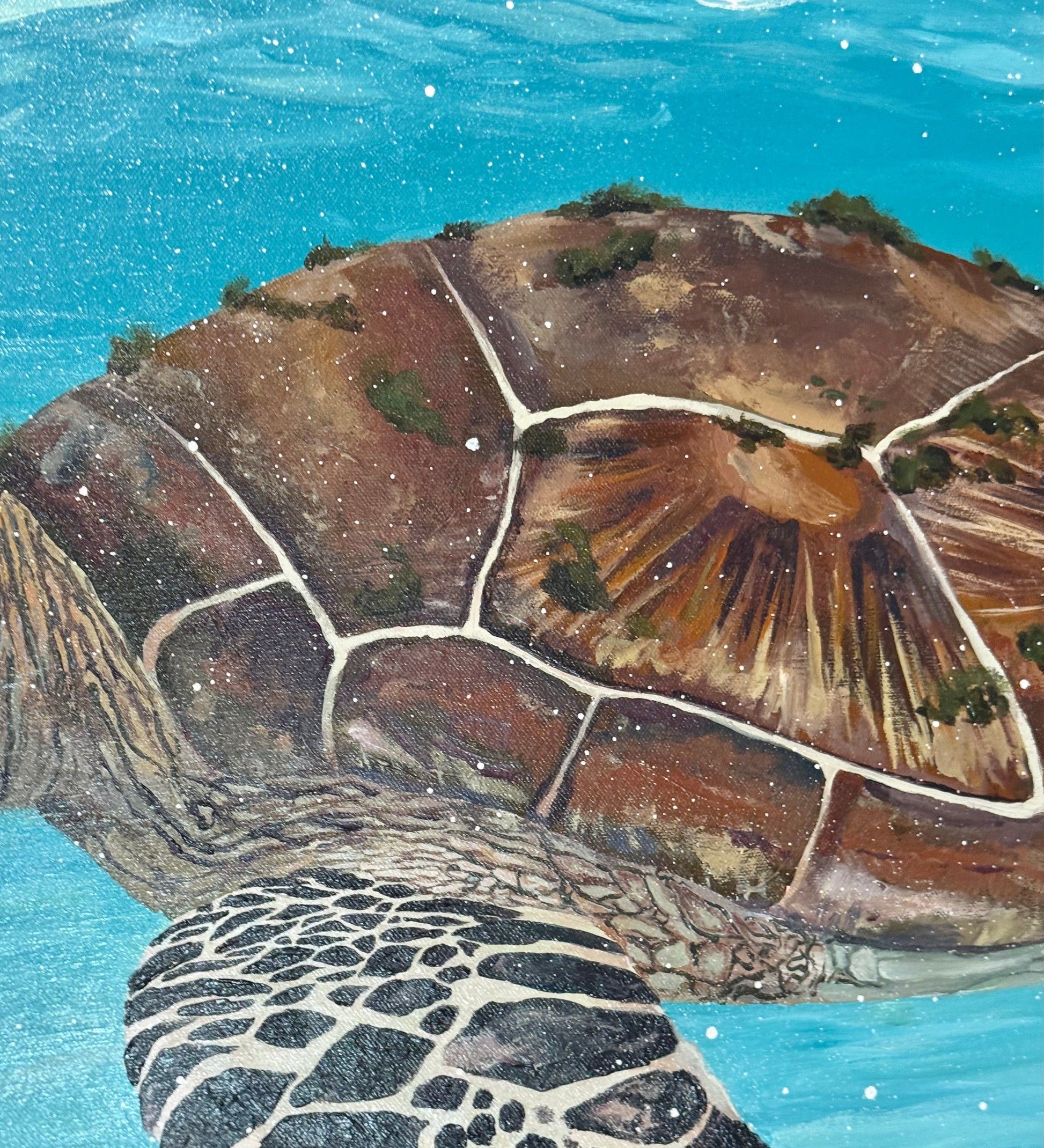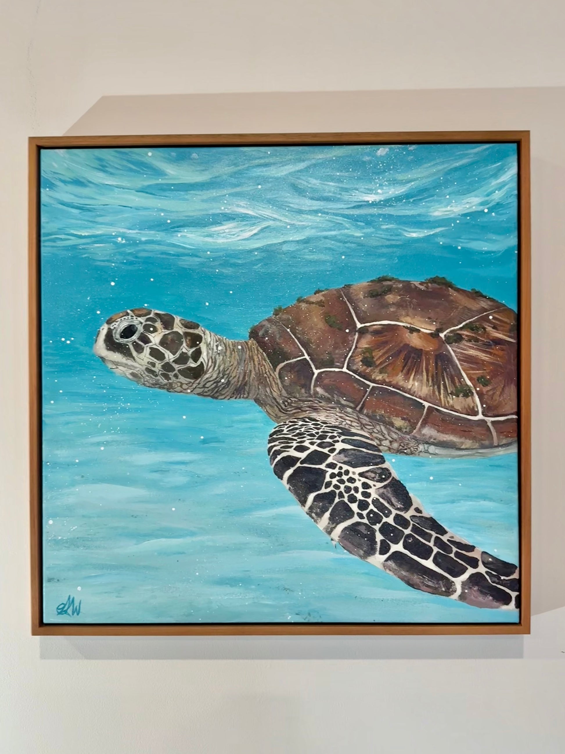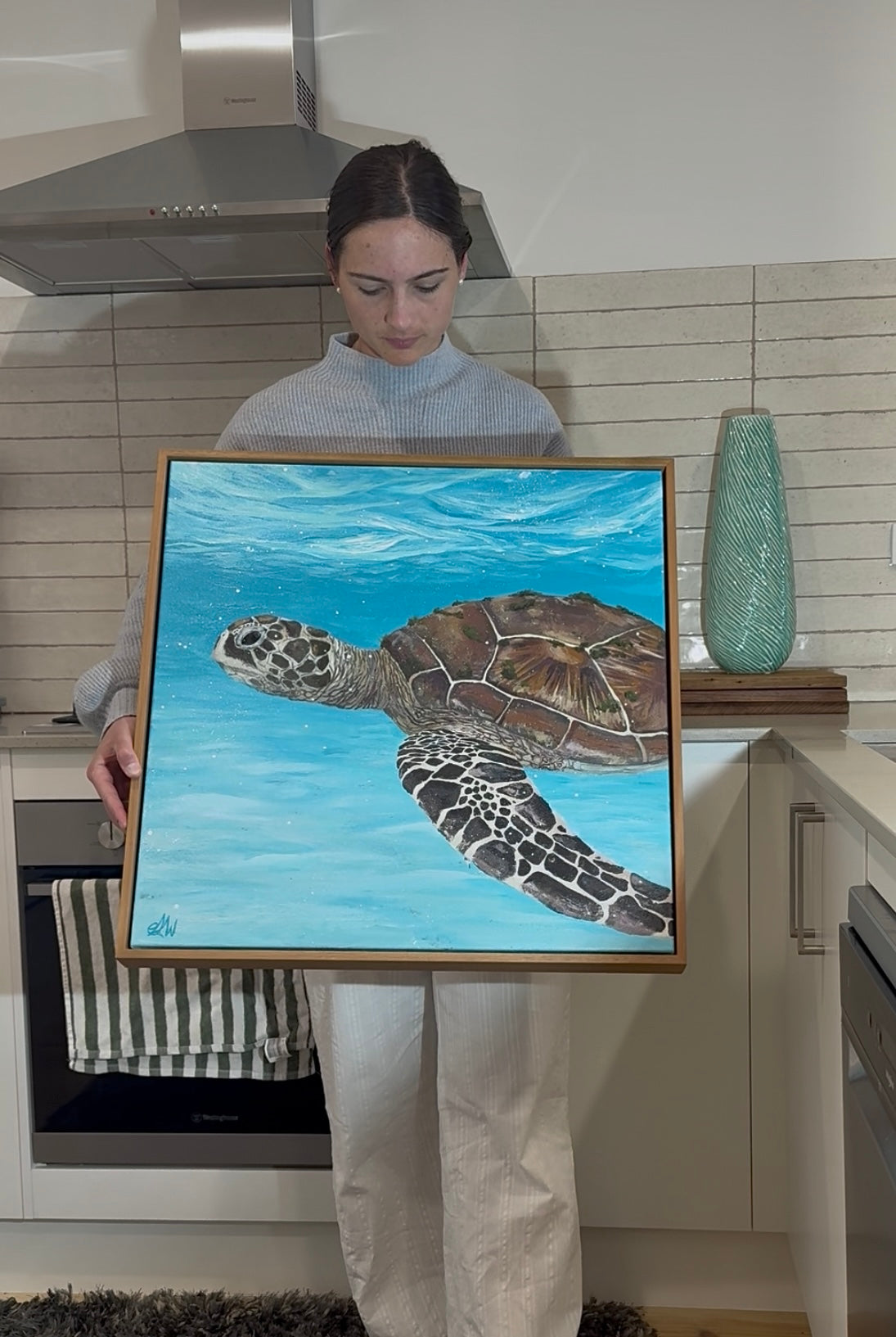 During my holiday in Vanuatu I was lucky enough to encounter turtles not only at a sanctuary but in the wild. They are so majestic and I love how they cruise through the ocean almost effortlessly. I used a strong aqua colour to replicate the stunning shores of the island of Efate. This painting is a direct reference from a photo captured on the holiday.