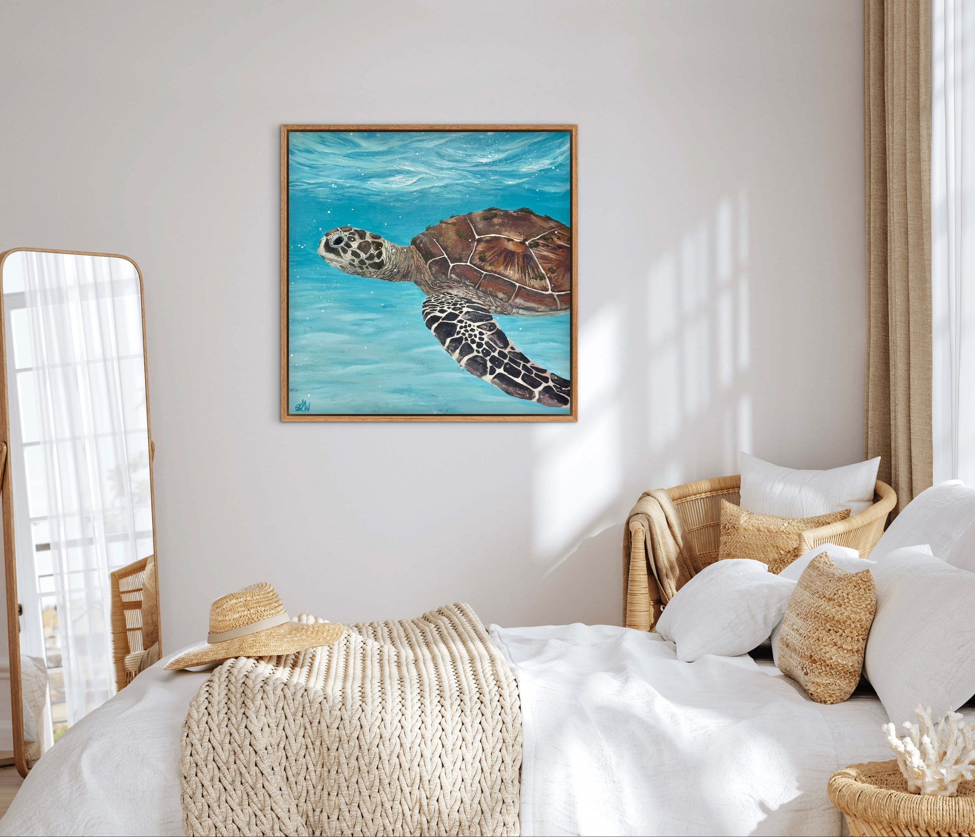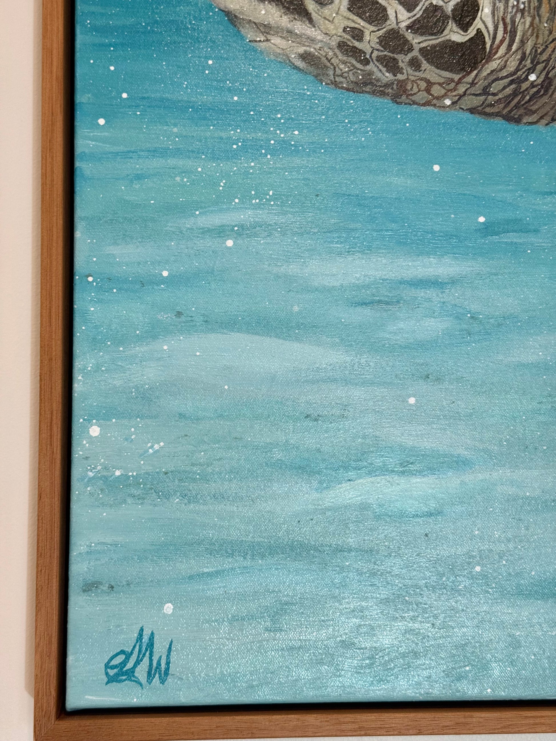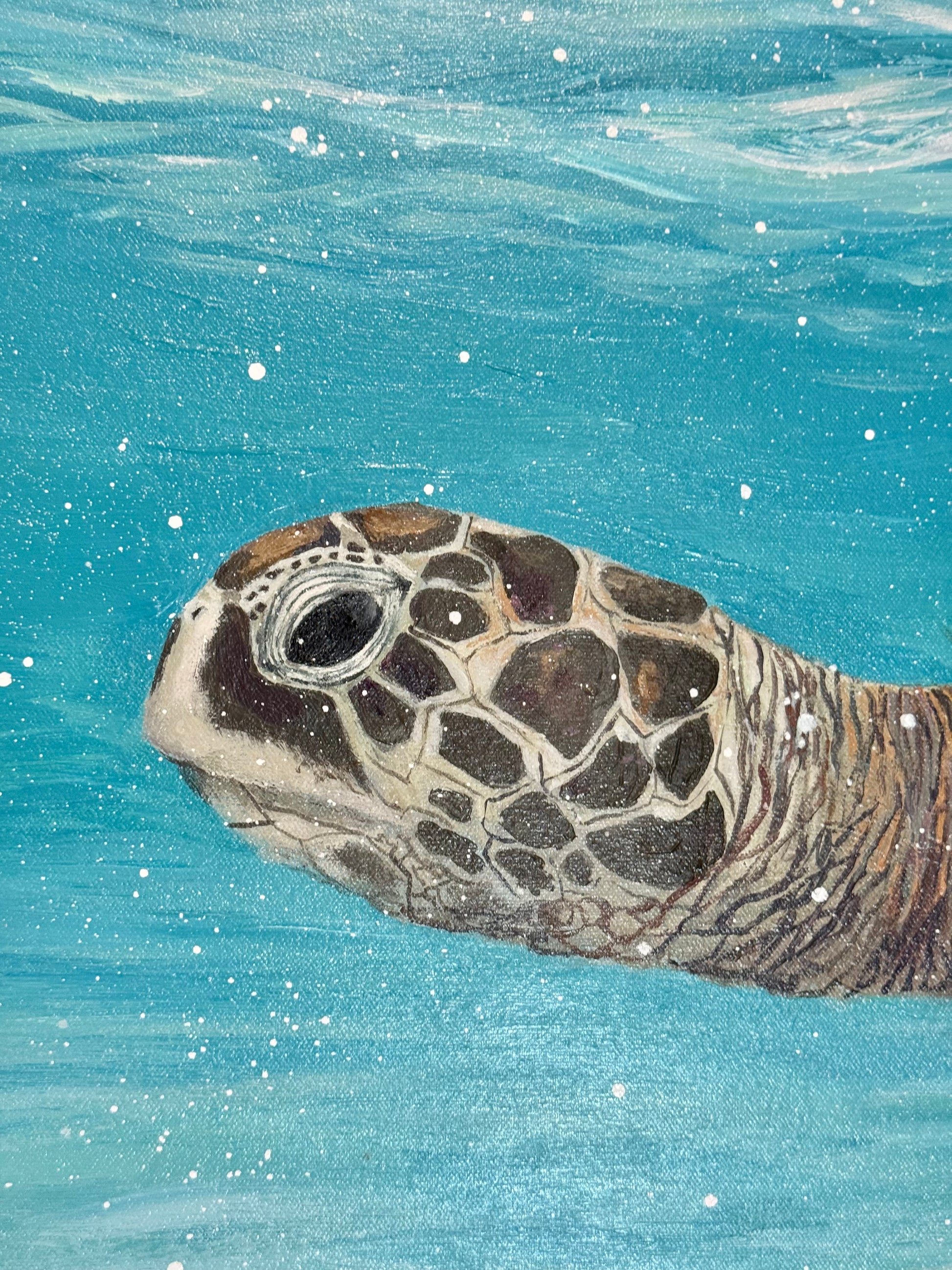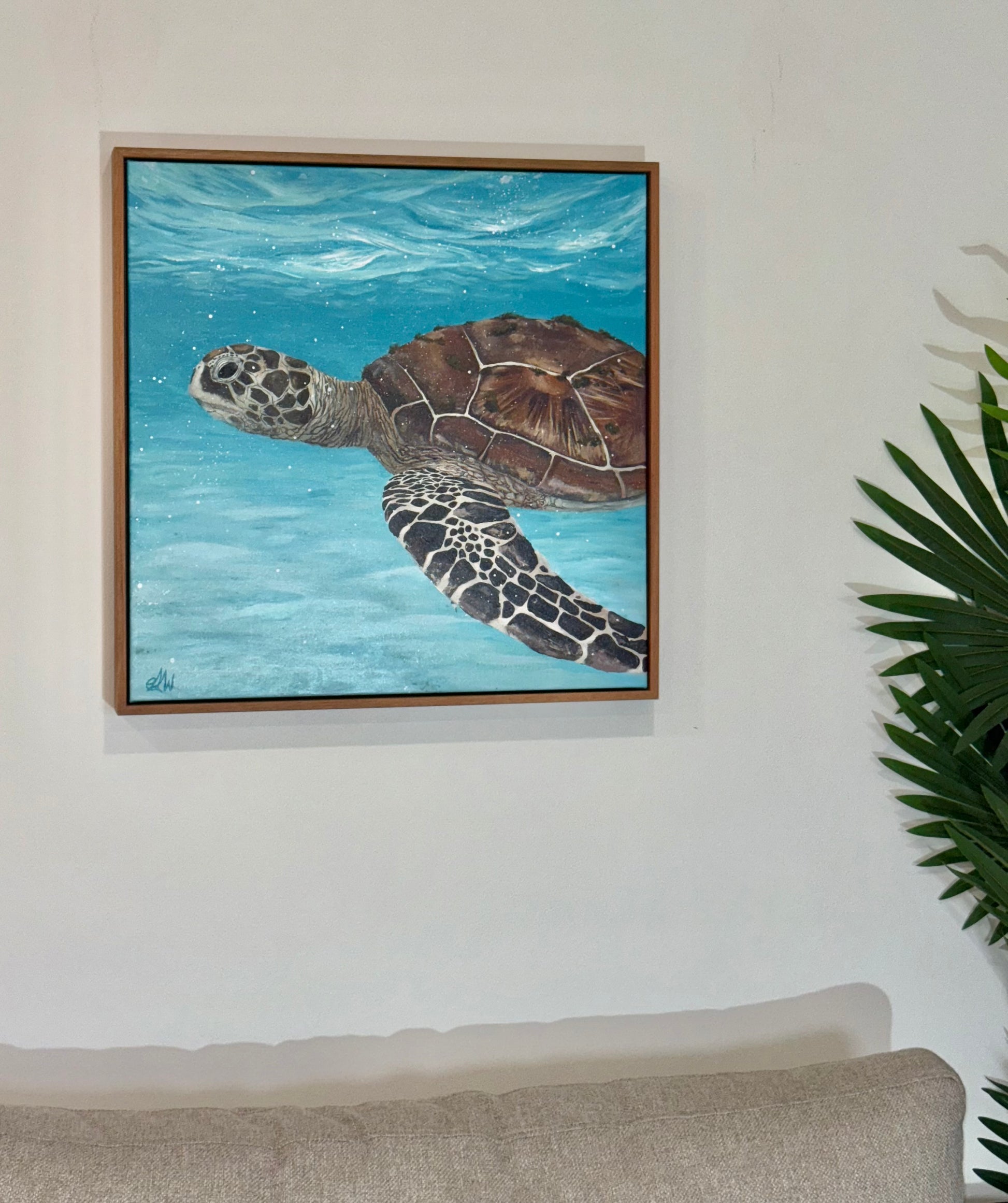 During my holiday in Vanuatu I was lucky enough to encounter turtles not only at a sanctuary but in the wild. They are so majestic and I love how they cruise through the ocean almost effortlessly. I used a strong aqua colour to replicate the stunning shores of the island of Efate. This painting is a direct reference from a photo captured on the holiday.