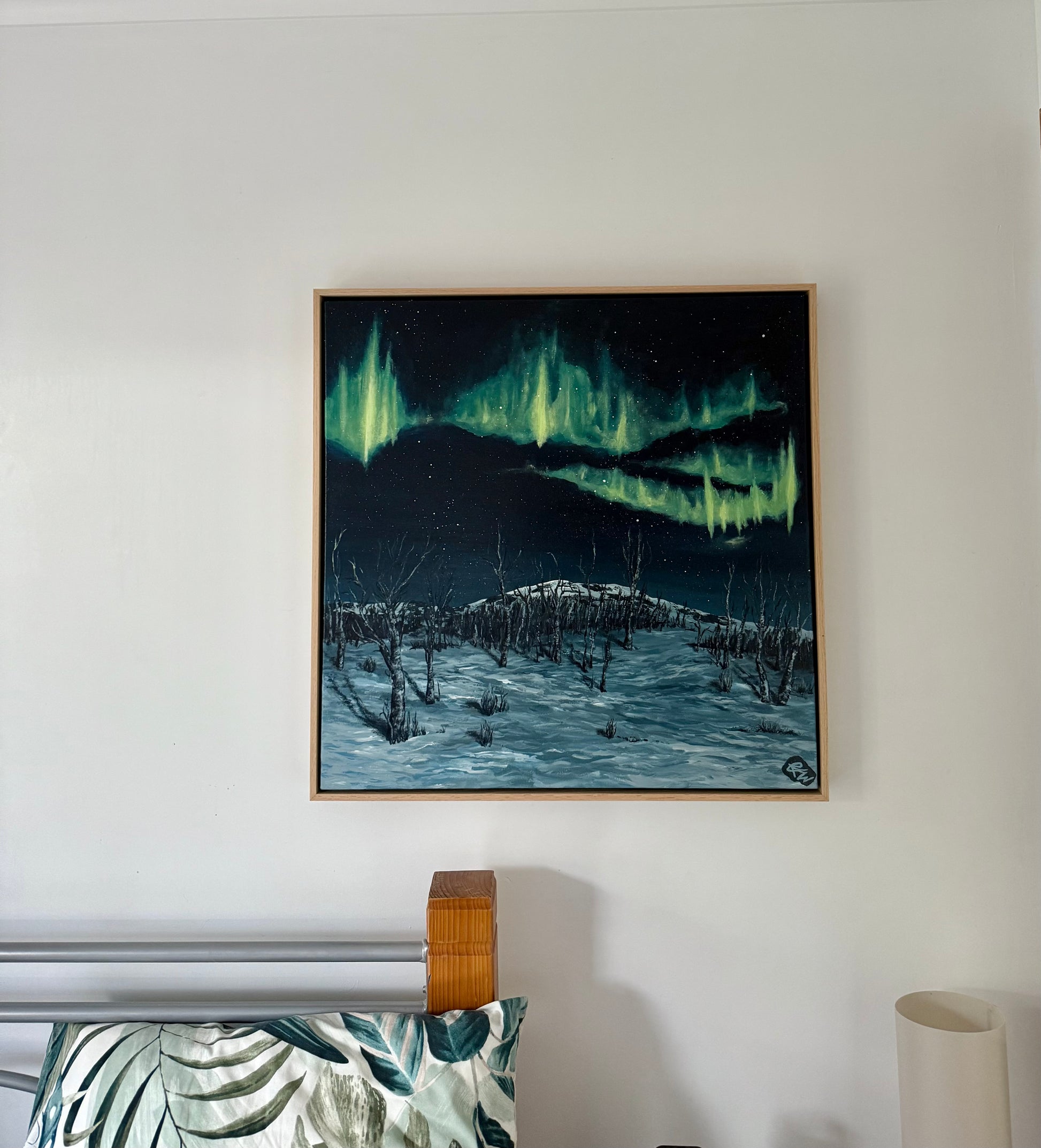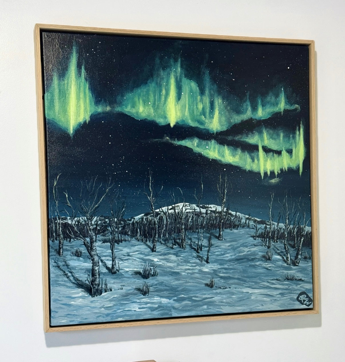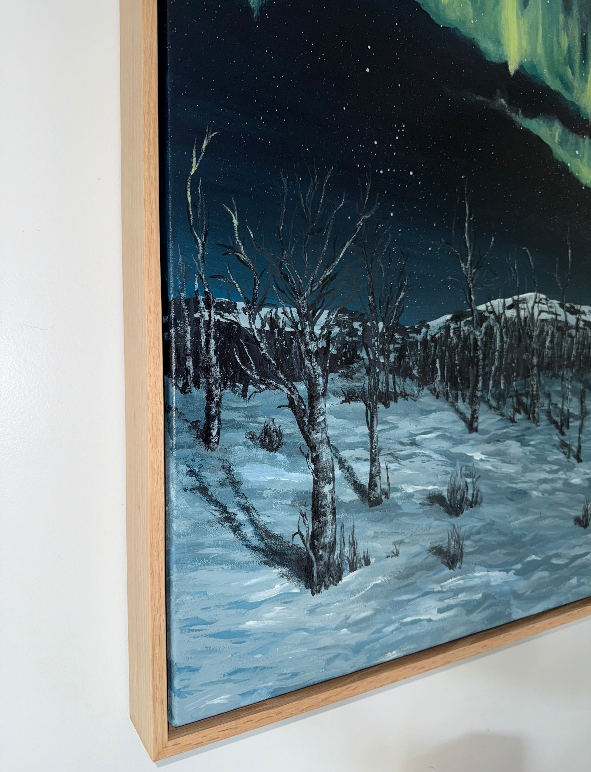 Highly textured acrylic on canvas. Inspired by multiple images I took in Finland. I was lucky enough to see the Aurora Borealis twice, once whilst in Norway and the other when in Finland. Using Icy colours I wanted to capture the crisp sub zero temperatures, and the bright moonlit snow from the full moon. When I experienced this image in person, it was tempting to not appreciate the snow, trees and colours of the earth as the sky was stealing the attention with the bright green smoke, but I really focused on ensuring I captured the beauty of the whole night not just the sky within this painting.