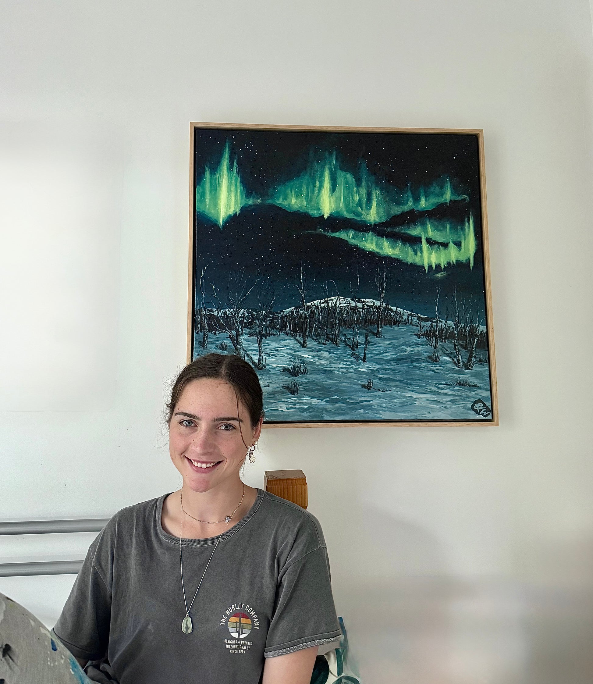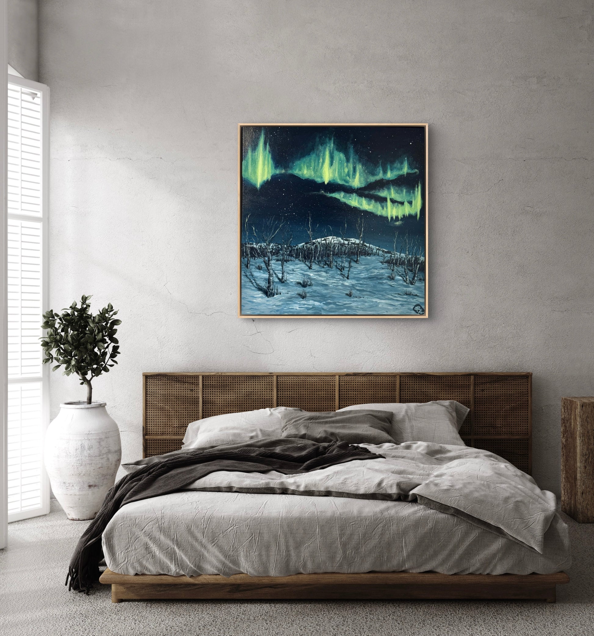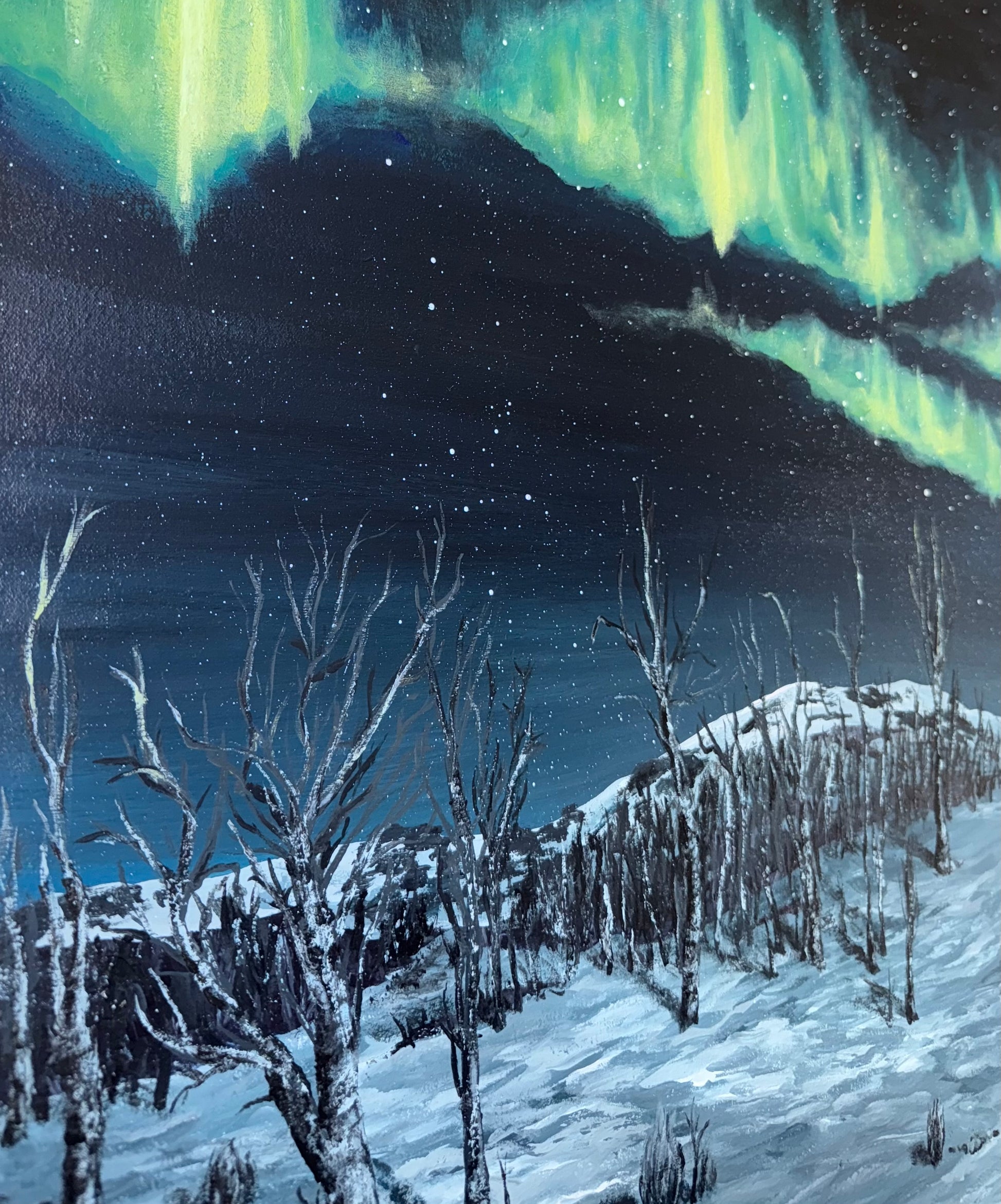 Highly textured acrylic on canvas. Inspired by multiple images I took in Finland. I was lucky enough to see the Aurora Borealis twice, once whilst in Norway and the other when in Finland. Using Icy colours I wanted to capture the crisp sub zero temperatures, and the bright moonlit snow from the full moon. When I experienced this image in person, it was tempting to not appreciate the snow, trees and colours of the earth as the sky was stealing the attention with the bright green smoke, but I really focused on ensuring I captured the beauty of the whole night not just the sky within this painting.