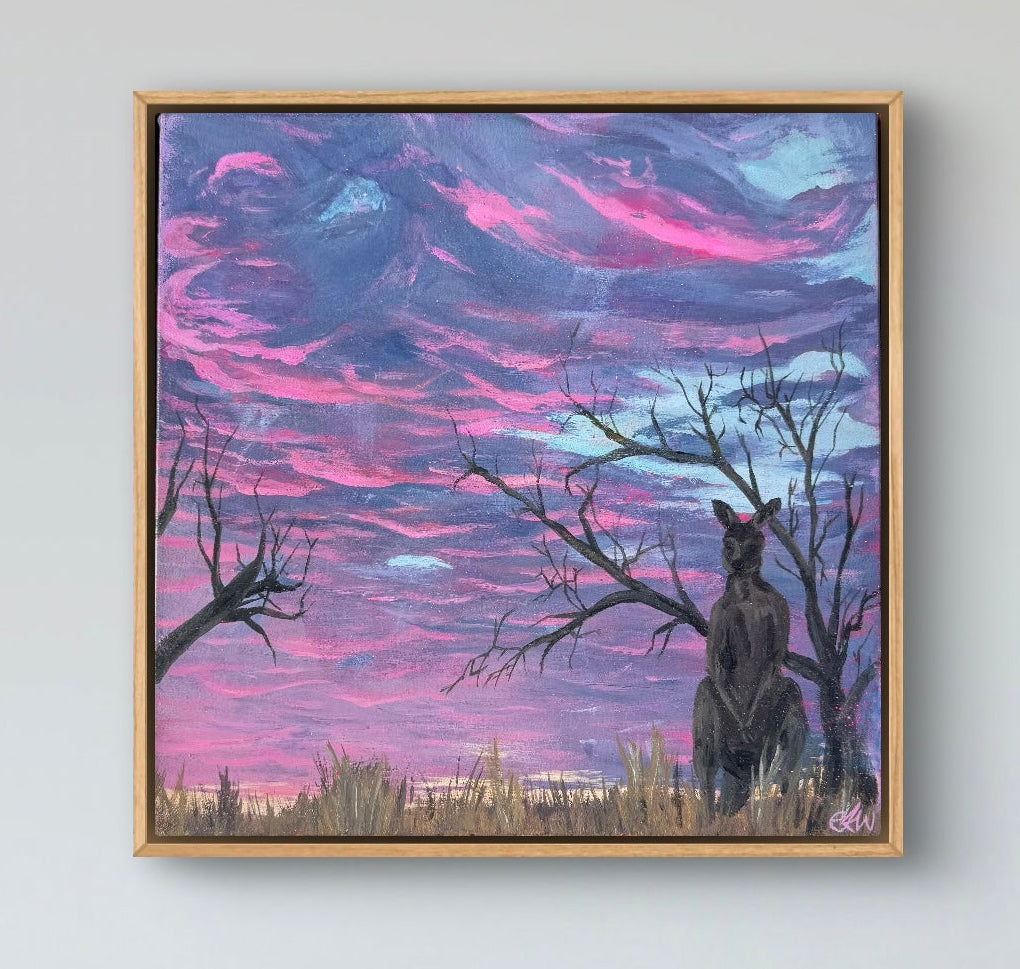 I took a photo early one morning just like this painting and I couldn’t believe the vibrancy of the pink and how it silhouetted a big buck. I tried to emphasise nature through the rough realism and tried to capture the energy of the sky with a fluorescent pink.