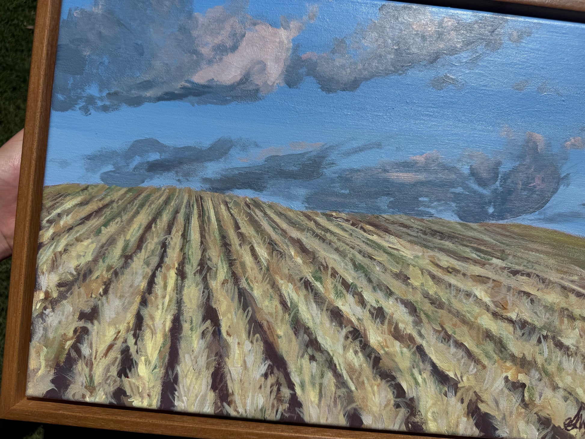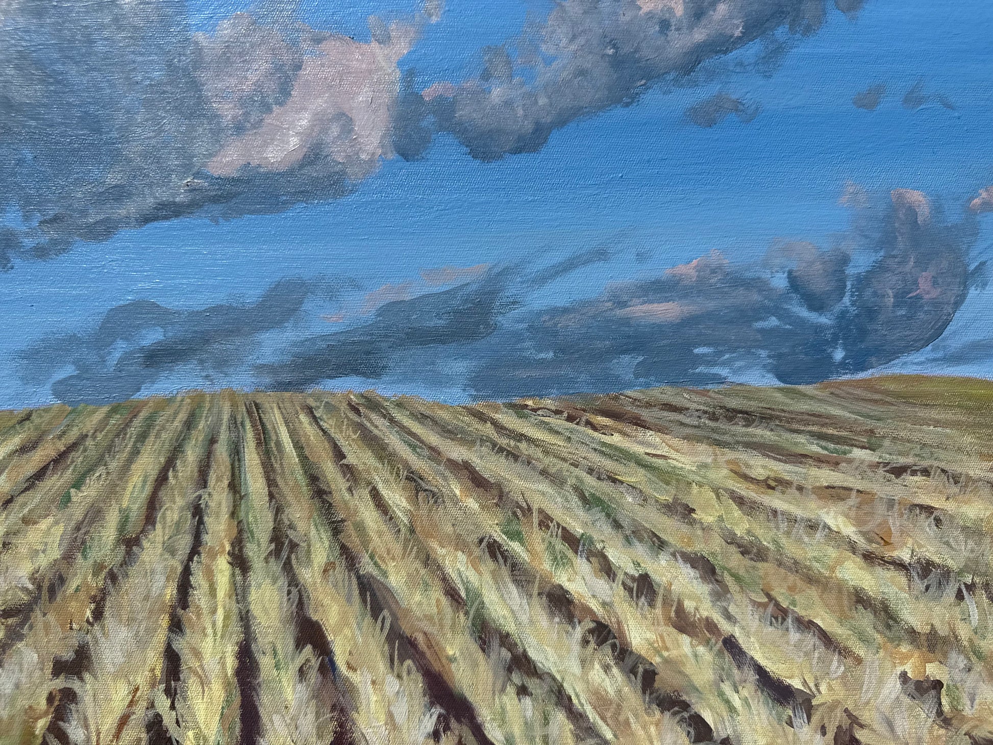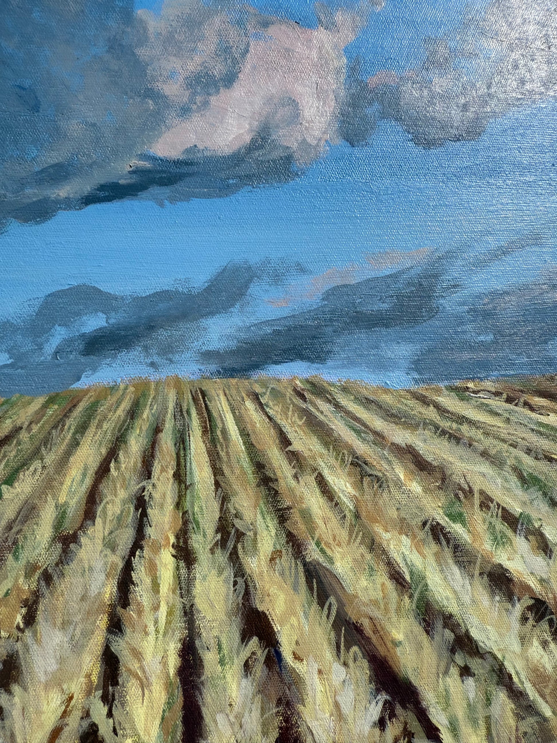 I have worked though many harvests in South Australia and this painting is a common view in my daily routine. I would typically drive 45 minutes every day through farming country taking in the landscape. As long as the days are during harvest, the site of the farms are always a beautiful view, and my favourite in particular is at dawn. When the morning is fresh, the sun is warming the crops and highlighting the clouds.