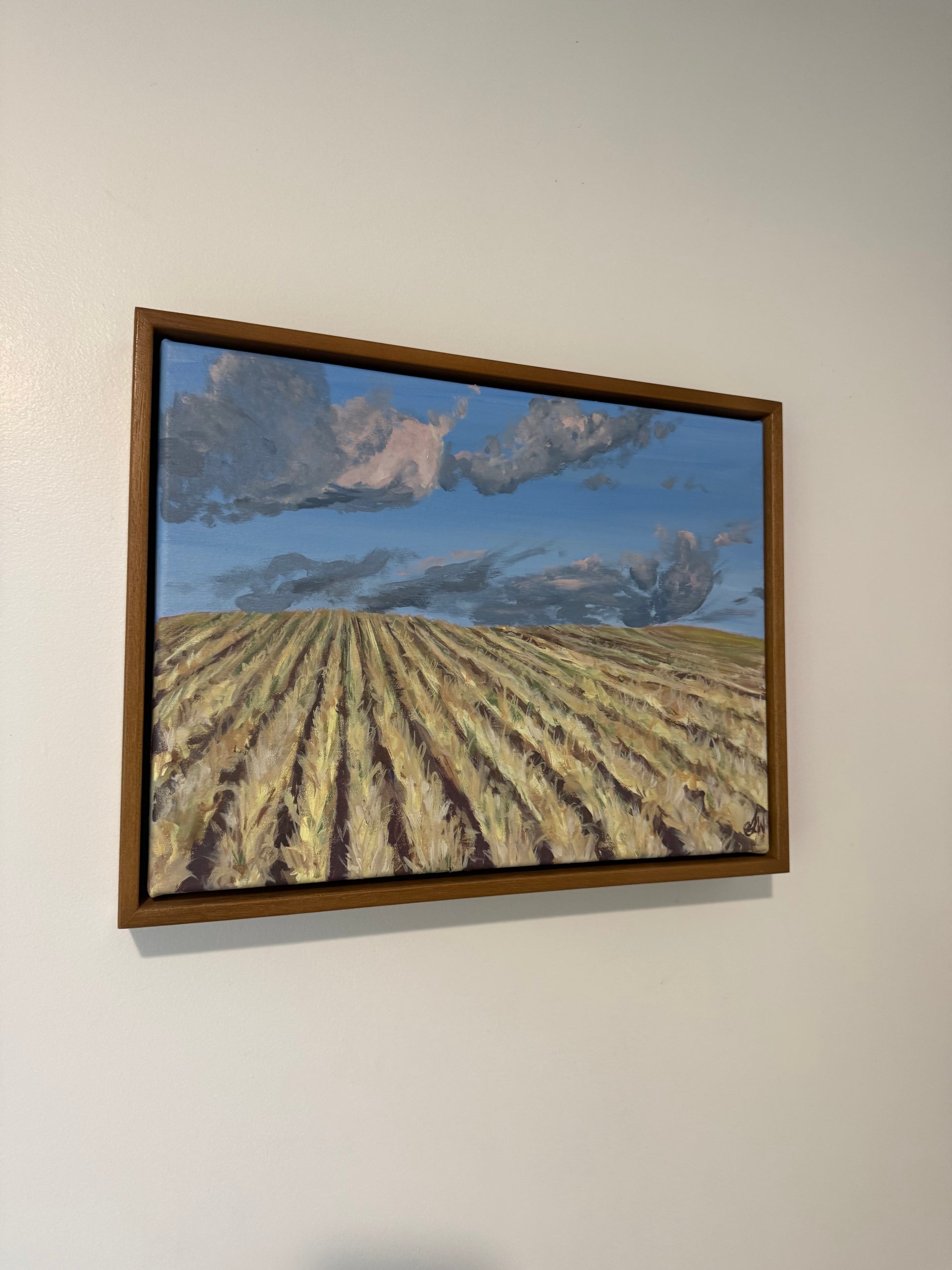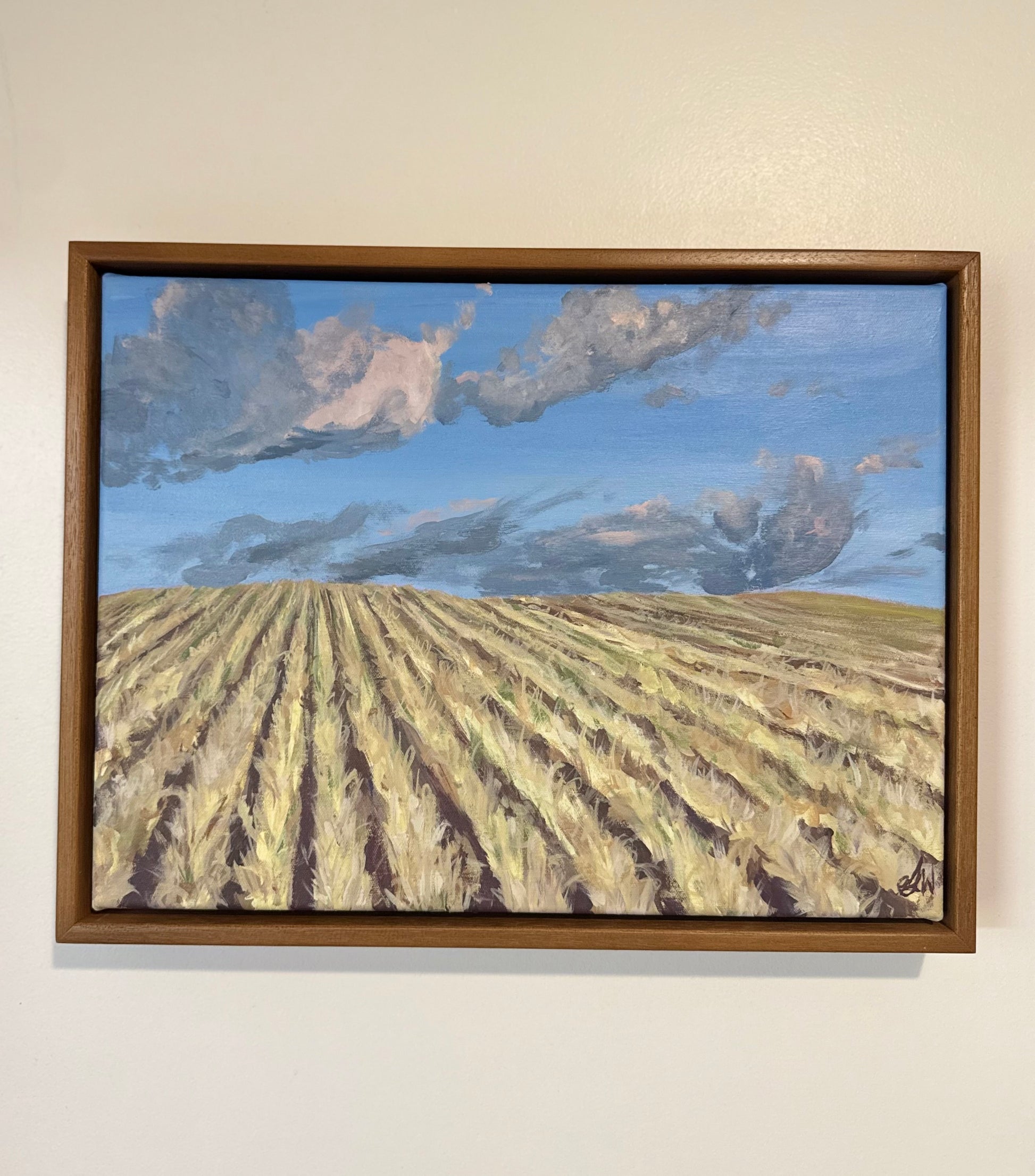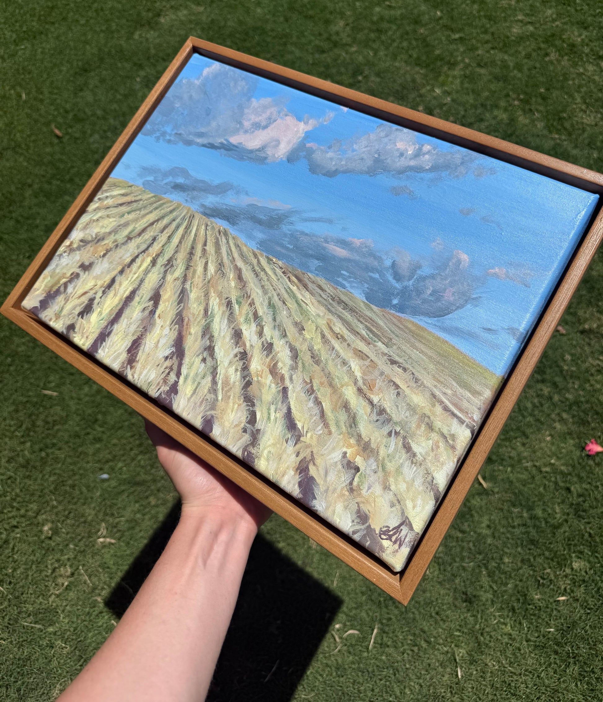 I have worked though many harvests in South Australia and this painting is a common view in my daily routine. I would typically drive 45 minutes every day through farming country taking in the landscape. As long as the days are during harvest, the site of the farms are always a beautiful view, and my favourite in particular is at dawn. When the morning is fresh, the sun is warming the crops and highlighting the clouds.