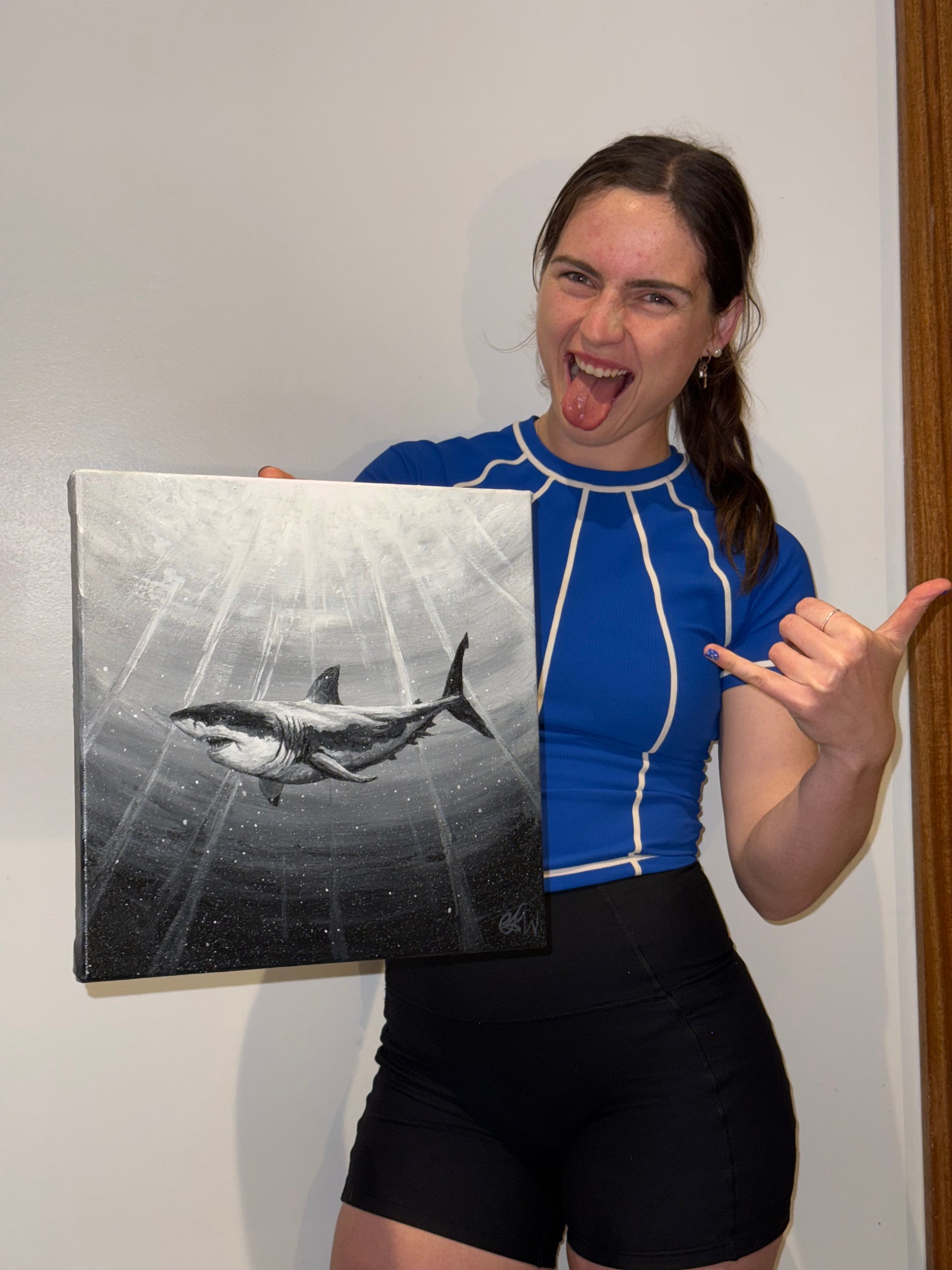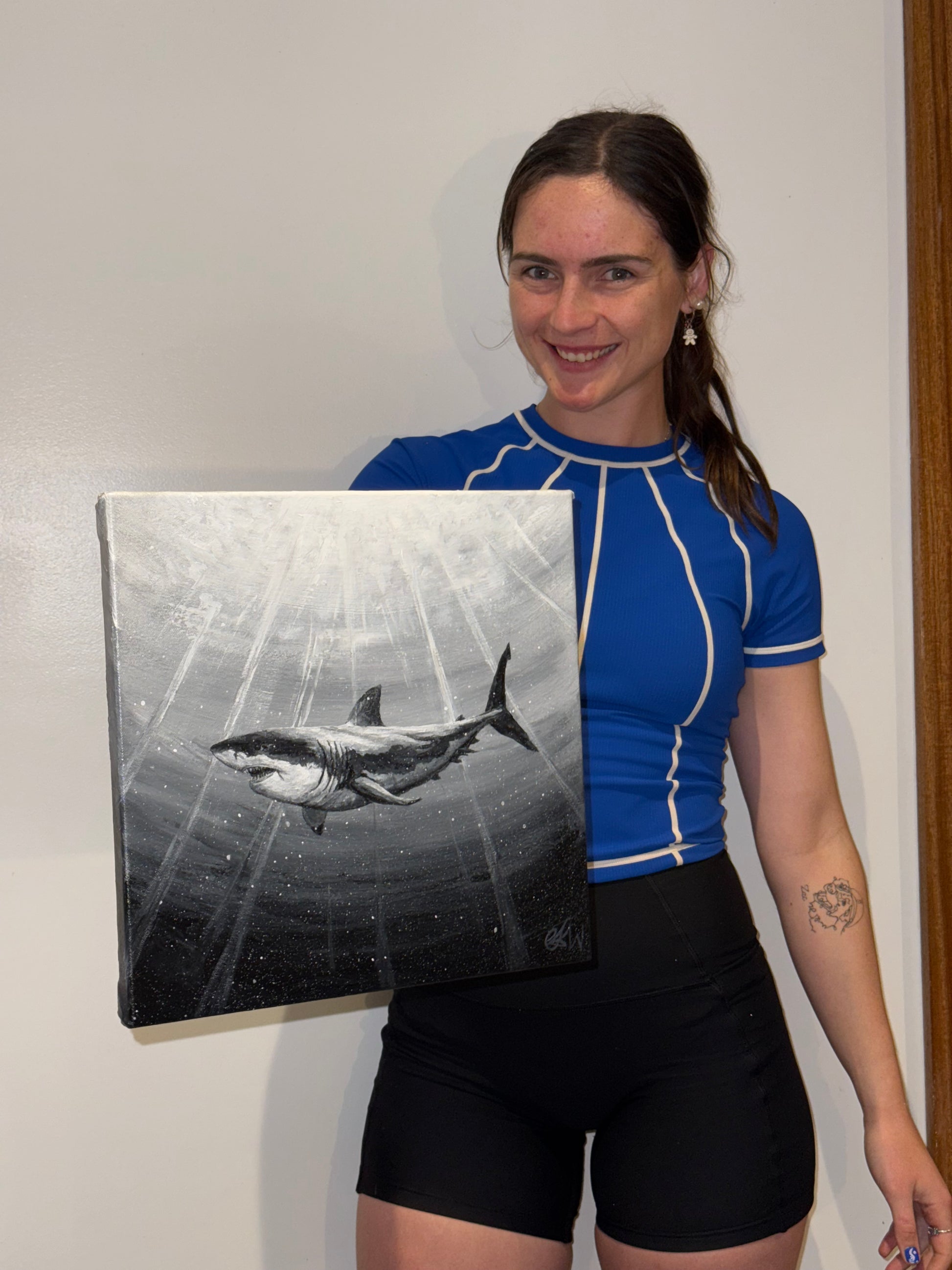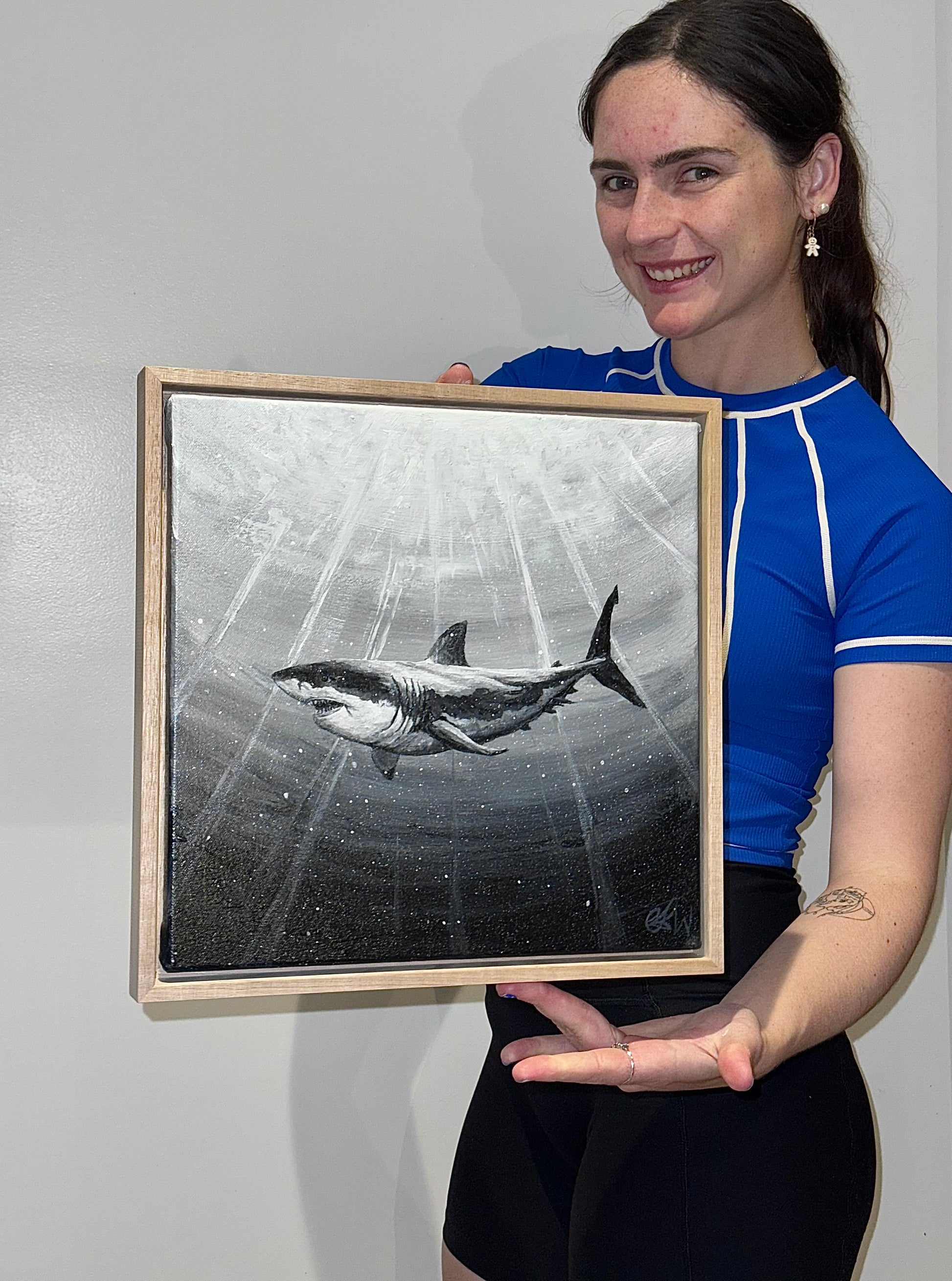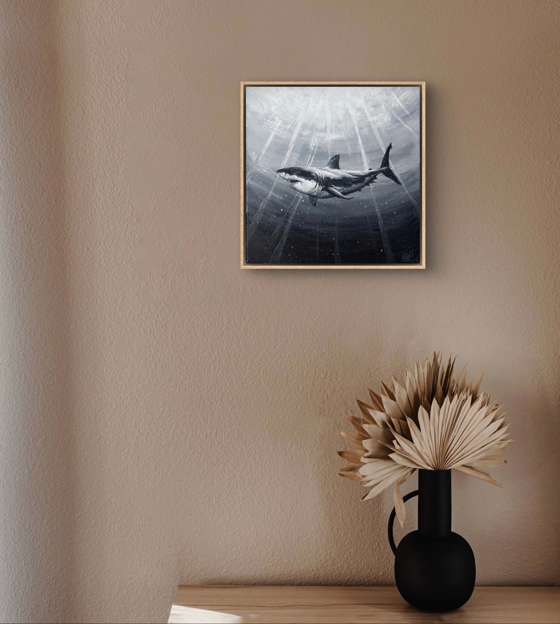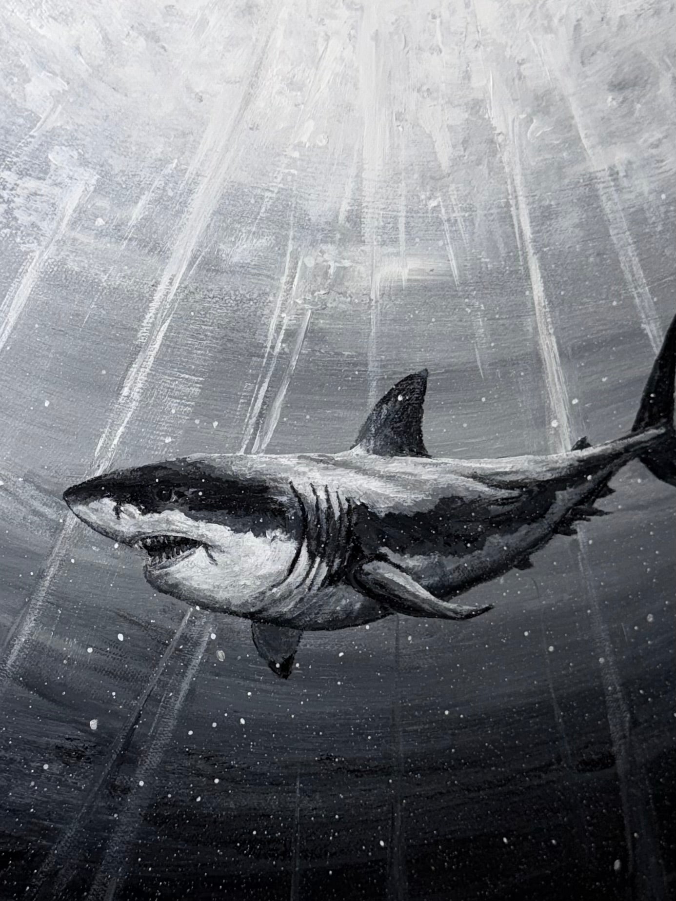 Using the oceans rays and shadowing to show a great white shark swaying through the depths, perhaps on the hunt. Searching the surface for anything to satisfy its hunger.